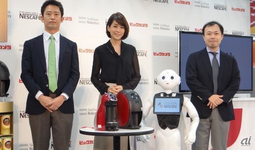 ▲ 네스카페 `페퍼` 설치 기념 사진. 맨 왼쪽 네슬레 일본 오오 켄스케 사업부장, 맨 오른쪽 소프트뱅크 요시다 켄이치 본부장<사진=씨넷재팬>
