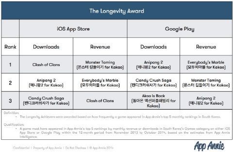 먼저 앱애니가 선정한 2014년도 최장기 인기 게임은 국내 월별 순위에서 상위 5위 내에 가장 오랜 기간 이름을 올린 게임이다. 출시 초반 반짝 인기를 모으는 데서 나아가 장기적으로 기존 이용자들의 사랑을 받는 데 성공, 지속적으로 수익을 창출했다는 뜻이다.