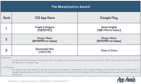 다운로드 수 대비 가장 높은 누적 수익을 달성한 최고 수익 달성 게임 부문에서는 ‘세븐나이츠’ ‘별이되어라!’ ‘클래시오브클랜’ ‘퍼즐앤드래곤’ ‘서머너즈워’가 선정됐다.